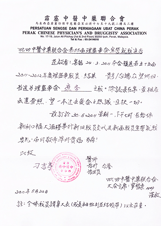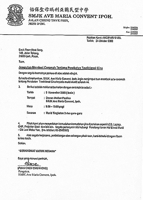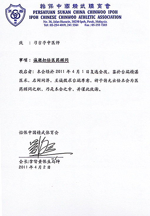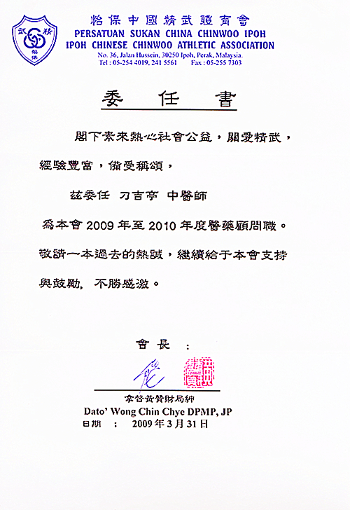 怡保中国精武体育馆 马来西亚中医师针灸专业学会 怡保中国精武体育馆委任书 怡保圣母玛利亚国民型中学 怡保育才国民型中学华文学会